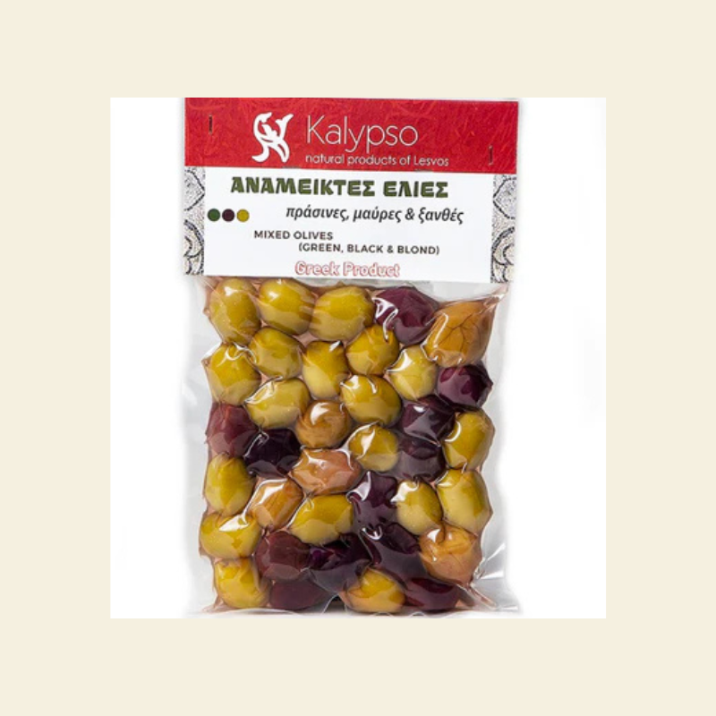 Măsline grecești mixte — maro, verzi și negre — în saramură naturală, ambalate vacuum pentru a păstra prospețimea și savoarea lor autentică din insula Lesvos.