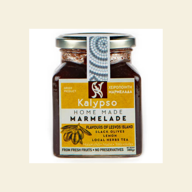 Gem artizanal de măsline negre cu lămâie și ierburi grecești — o combinație mediteraneană inedită, fabricată manual de producători locali din insula Lesvos.